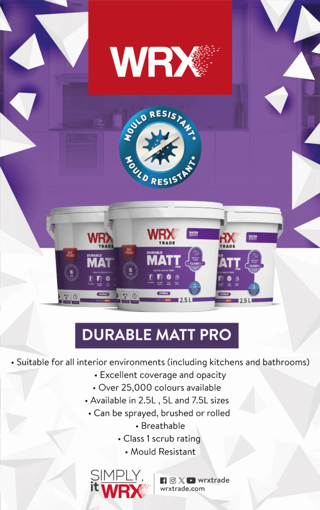 Top-quality, water-based washable interior top-coat paint based on acrylic emulsion offering a smooth matt finish. Suitable for use on standard interior wall and ceiling surfaces. Its advanced anti-mould formula helps prevent fungal and mould growth, keeping walls fresher and cleaner for longer. The durable surface allows marks and stains to be easily wiped away. It gives a tough film with high scrub resistance (Class 1 for ISO 11998) and provides long-lasting protection for interior surfaces. It delivers excellent coverage with a high-quality finish, is easy to apply, and leaves no brush or roller marks.